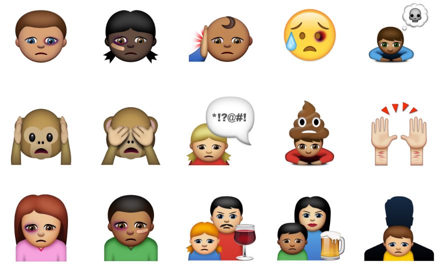 “Abused Emoji” are initially available for Apple iOS devices and allow kids to swap out their standard iPhone keyboard for a set of character symbols customised from ones they might commonly use in their day to day communications with pals, but instead of the usual ‘smileys’ the ones on offer here all suggest themes of child abuse and threat.The symbols are fairly open to interpretation and some are downright disturbing and sure to draw concern from any recipient. They feature no words but give a clear message that something isn’t right with some of the graphics depicting physical violence (faces with bruised eyes), verbal abuse (sad child with expletive speech bubble directed at them), suicidal thoughts (boy with a skull think bubble above him), alcoholic parents (child and an imposing adult with a glass) and feelings of worthlessness (which you can work out for yourself).