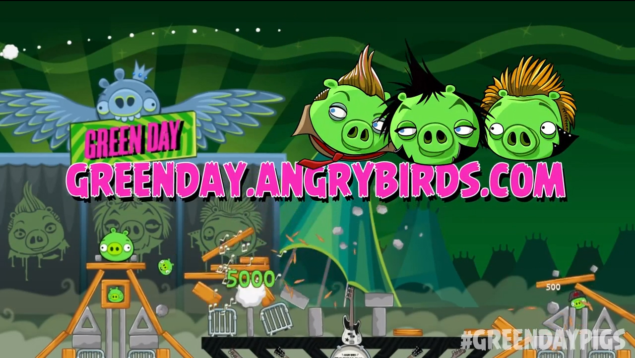 Ahead of a rumoured appearance at this weekend’s Reading Festival, Green Day have turned into green pigs for Angry Birds Friends – the Facebook based app game which will receive an update with 10 new playable levels which include a punk rock and festival flavour and will feature the band’s new song ‘Oh Love’ and another bonus track called ‘Troublemaker’. This is a song title that certainly suits the trio’s dastardly deeds as they join forces with the Angry Birds’ long time porky persecutors!