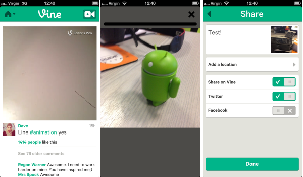 People have already started experimenting with Vine, creating some pretty cool stop motion animations. Videos can be captured with and without sound, and when browsing through your homepage you’ll have the option to play and pause other people’s videos with a single tap.