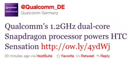 Jumping the gun for a little self-promotion, Qualcomm_DE boasts “Qualcomm’s 1.2Hz dual-core Snapdragon processor powers HTC Sensation”, the tweet also featuring a link to a YouTube video explaining about the Snapdragon processor itself.