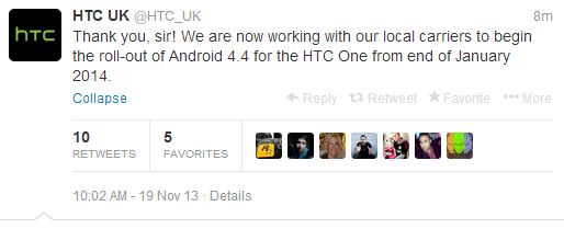 In a tweet presumably intended as a reply to a fan, HTC UK confirmed on Twitter that it is currently working with networks and local carriers so that the roll-out of Android 4.4 for the HTC One can begin at the end of January next year.