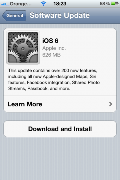 You should see the screen above, which means you’re ready to download the update. We’d recommend backing up your iPhone to iCloud or iTunes before doing anything, just in case. Let us know how you get on with iOS 6!