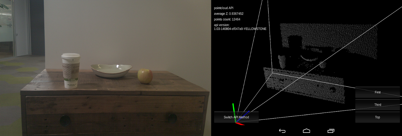 “The Project Tango APIs provide a function to get depth data in the form of a point cloud. This format gives (x, y, z) coordinates for as many points in the scene as are possible to calculate. Each dimension is a floating point value recording the position of each point in meters in the coordinate frame of the depth-sensing camera.”