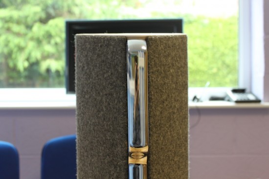The top and bottom ends feature a glossy white tough plastic to contrast the cashmere centre, and on the rear edge is a thick chrome handle running from the top to around half-way down. This seems slightly odd at first, but feels incredibly well made and makes moving the speaker very easy, which leads us on to our next point: this speaker weighs a ton! When we first picked it up by the handle we were surprised by the weight, but this gives the pleasant feeling of a well-made gadget.