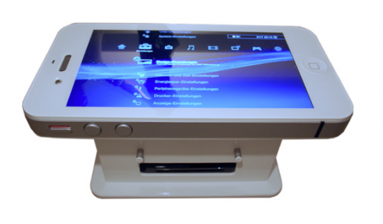 The screen itself a Toshiba 40” screen capable of displaying Full HD 1080p content in stunning quality with a content ratio of 45,000:1. Inside the base of the table is a computer with a 2GHz processor, 4GB of RAM and a 500GB Hard Drive which is capable of booting either Windows 7 or Mac OS X, which is then displayed on the large iPhone screen.