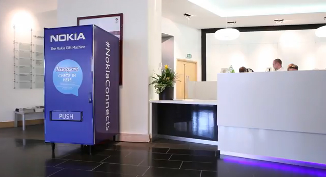 Nokia marketing director says “”The Nokia Gift Machine is Nokia’s way of giving something back to the attendees of Social Media Week. Working with the very latest Foursquare APIs, as well as Foursquare’s various teams Stateside to help create this awesome piece of tech has been a fantastic experience and overall, we couldn’t be happier with the result.”