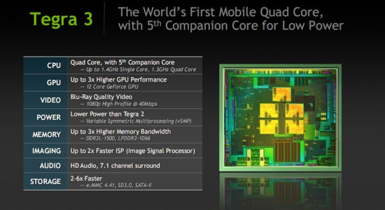 The Tegra 3 chip consists of four Cortex A9 cores, each clocked at 1.3GHz, with 12 cores of graphics processing. Nvidia says this will triple the quality of graphics when compared to mobile devices that use the Tegra 2 dual-core chipset.
