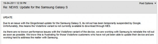 Updating to 2.3 has been suspended via Kies, Samsung’s PC suite for the handset, though there are still ROMs of the software floating around the web which you can still install onto your device if you’re really desperate. We would recommend awaiting an official update via Kies for the meantime.