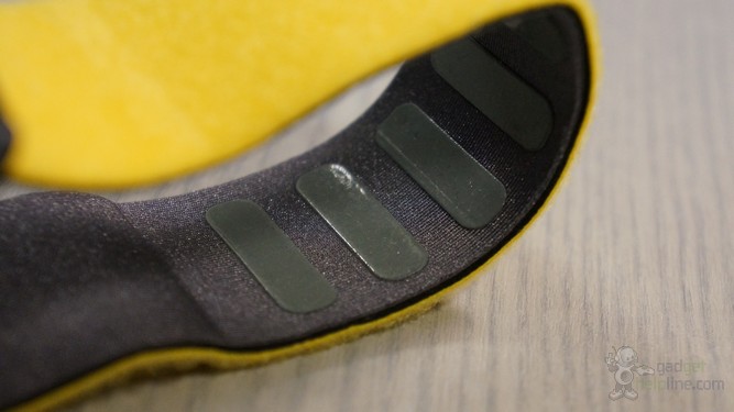 The RHYTHM’s technology is simple and is housed in a small bump. Three grey rubber buttons punctuate the yellow casing, providing controls for Bluetooth pairing and volume increase and decrease. Each button is pretty shallow and as such is quite easy to press, which is welcome.