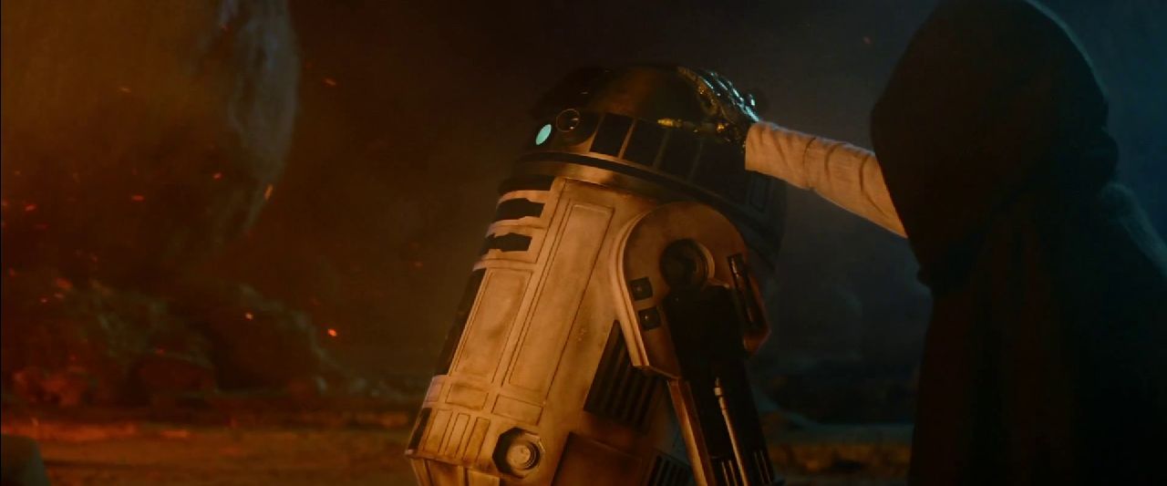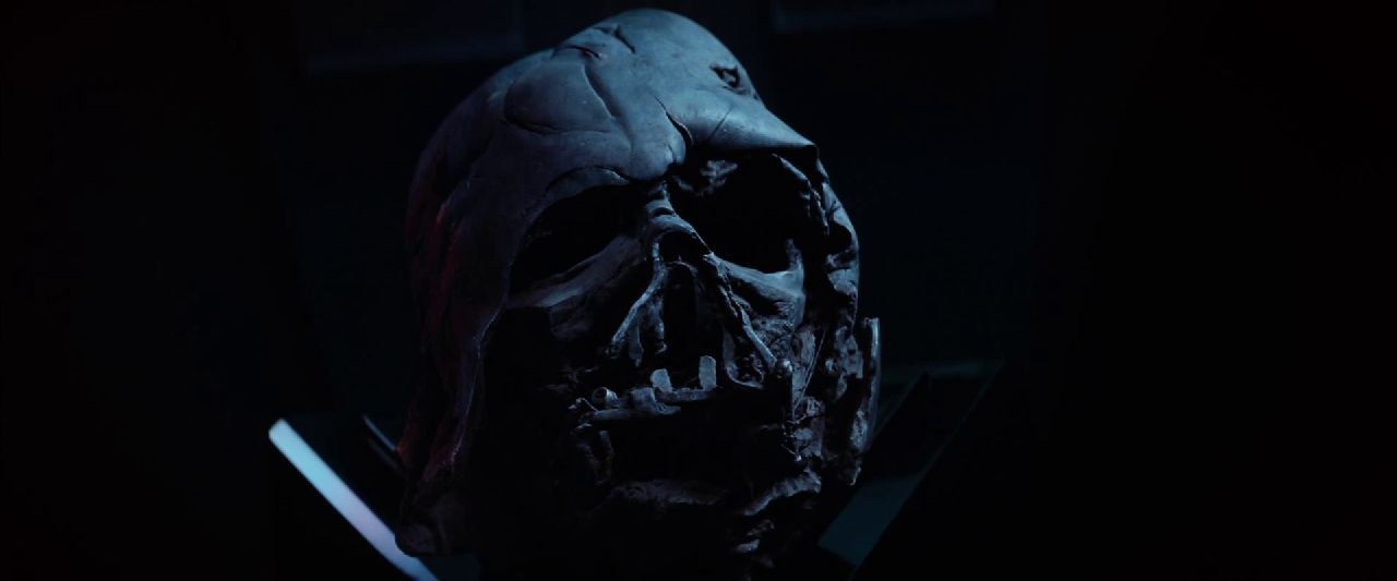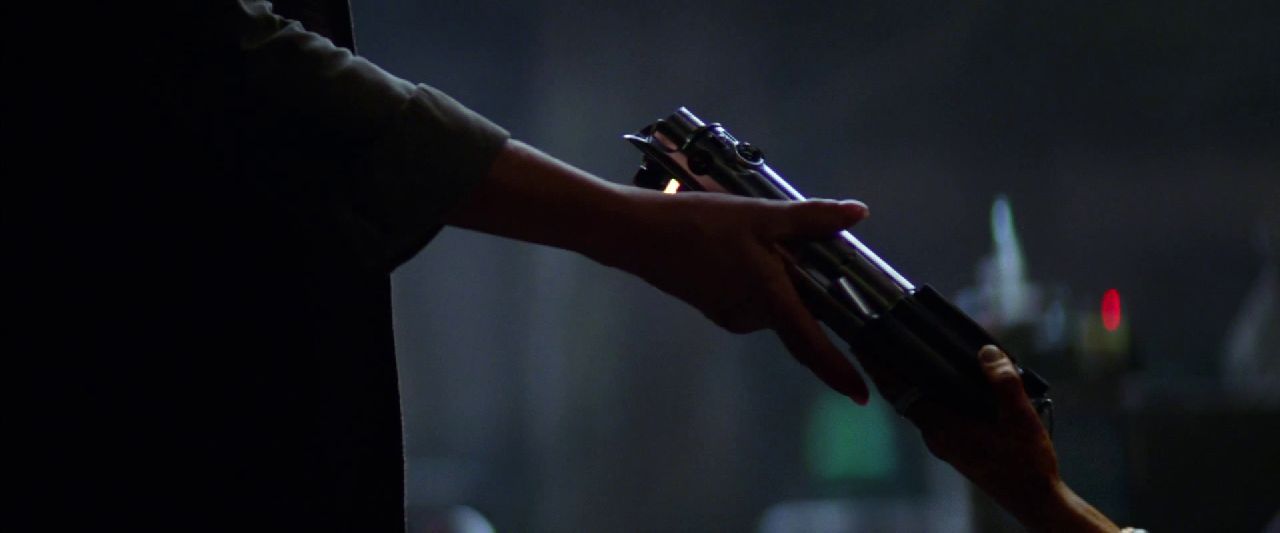 The scene fades to black and we’re greeted by a very familiar voice. Yes fans – that’s Luke Skywalker speaking:“The Force is strong in my family. My Father has it. I have it. My sister has it. You have that power too” he says, over a montage of new footage of things we know so well – The broken helmet of Darth Vader, Luke’s robotic hand reaching out to R2D2, and then passing his lightsaber over to someone else, presumably his child. Here’s another sequence where the old gives way to the new.