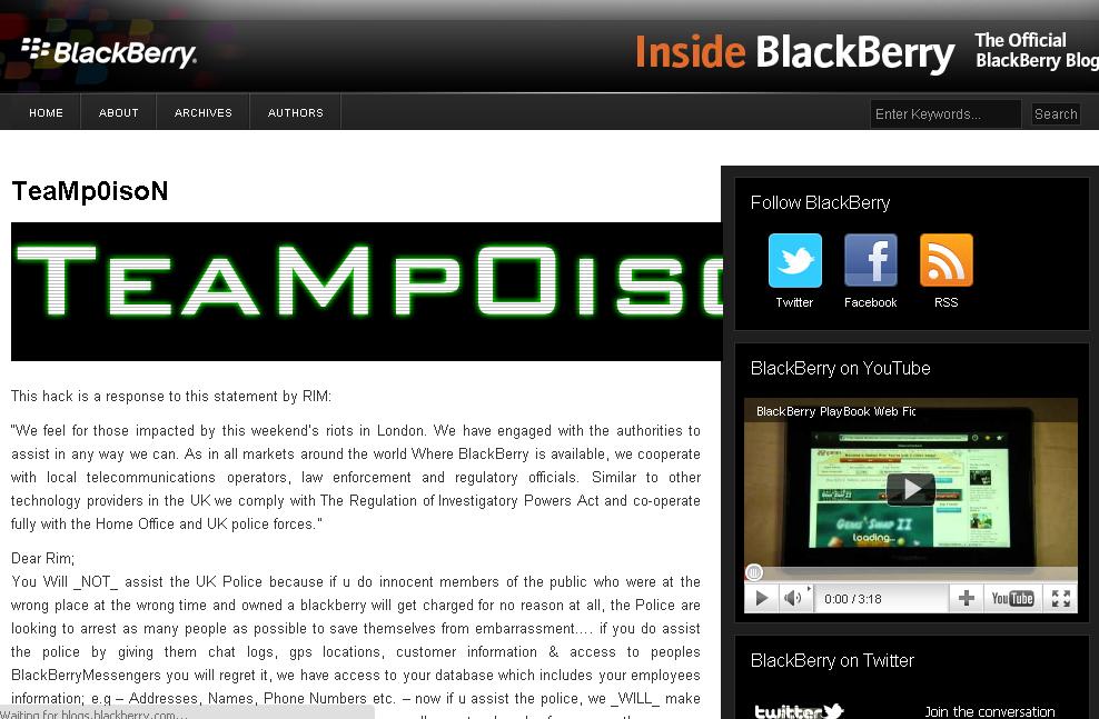 RIM’s Official Blackberry Blog has been hacked by a group of people who feel that their involvement with the UK Metropolitan Police and Government to… Read More »Official Blackberry Blog Site Hacked – Hackers Don’t Want RIM Helping UK Police With Riots