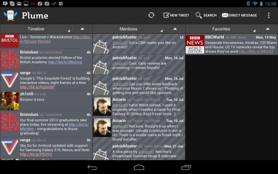 The official Twitter app is terrible. I’m not quite sure how that’s possible, but I’m guessing it has something to do with the relative unpopularity of Android tablets (at least before now). Until that app is fixed, the best alternative is an app called Plume. It offers a proper three-column tablet layout that suits the Google Nexus 7 fine, and generally seems responsive, although the free version’s ads are annoying as normal.