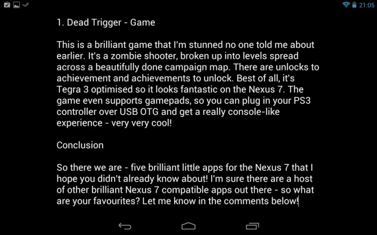 So there we have it – five brilliant apps for the Nexus 7. I’m sure there are more out there – what are your favourites? Let me know in the comments below and have a great day!