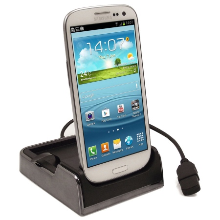This Samsung Galaxy SIII desk stand is multifunctional, allowing you to keep your Galaxy S3 and a second, spare battery charged all in one convenient place. As well as charging the two batteries simultaneously, the desk stand is perfect for syncing contacts to your computer and keeping your phone in a convenient position for viewing incoming notifications or browsing the web. Unfortunately, HDMI output and landscape mode isn’t supported.