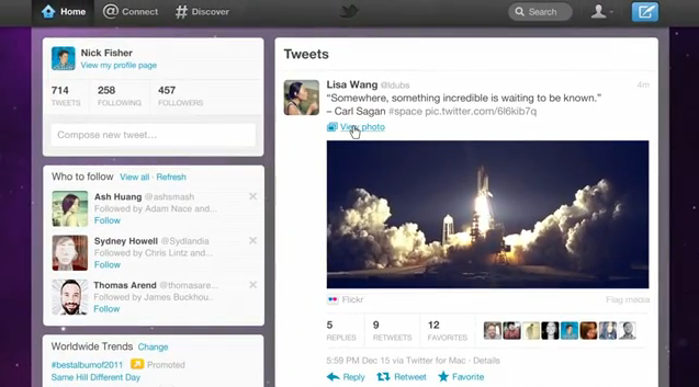 Noticeably first-hand is the side switch of timeline and everything else (who to follow etc etc..) – Twitter has flipped the bird and you’ll now find your real-time feed on the right. Seemingly without any real reason! But what is good is the addition of a new menu bar including Home, Connect and Discover tabs. Home is an easy one and allows you to nip back to the start at any time. Connect is your new Activity, which lets you see you’re most recent followers as well as check up on any mentions you might have or if your tweets have been retweeted. Discover is a very cool addition. Based on Twitter’s trendy hashtagging concept, you’ll now be able to use the Discover feature to browse for popular topics and current trends and discover new ones as they break cover (hence the name).