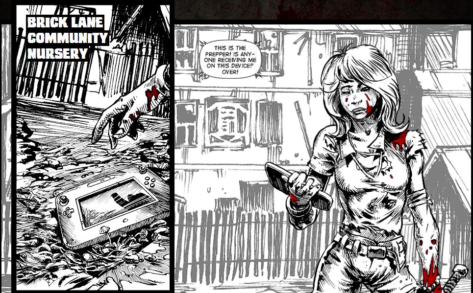 The 14 episode ZombiU comic series was used to lead up to the games launch and details the first fortnight of the outbreak and the events leading into where we pick up from in the game as we guide various survivors through the Underground network and the streets of our infested capital city. The animated black and white strips (much borrowing from the style of the aforementioned The Walking Dead books) introduces us to the ‘Prepper’ – the voice that directs us in the ZombiU game and his creation the ‘Prepper Pad’, or more familiarly to us the Nintento Wii U GamePad which is used as a radar and scanner and can be used for a multitude of functions in the game’s survival experience.