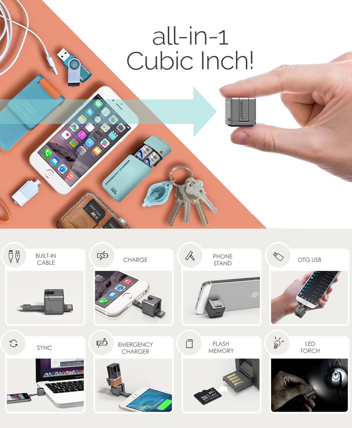 “Introducing WonderCube, the world’s smallest all-in-1 mobile solution for on the go generation, small enough to sit on your fingertip. It can unfold and transform in many ways. WonderCube is durable, super tiny and lightweight. It lives on your key ring and always be there when you need it.