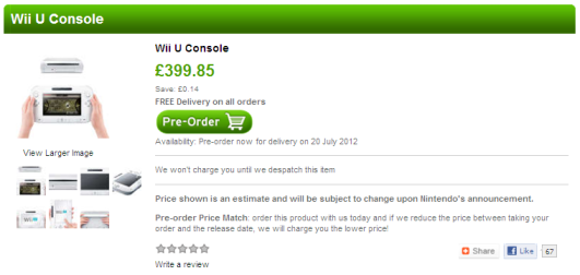 They won’t actually take your money until they dispatch the goods – over 13 months away and currently you can save a whole 14 pence on the Wii U console if you order through Zavvi today.
